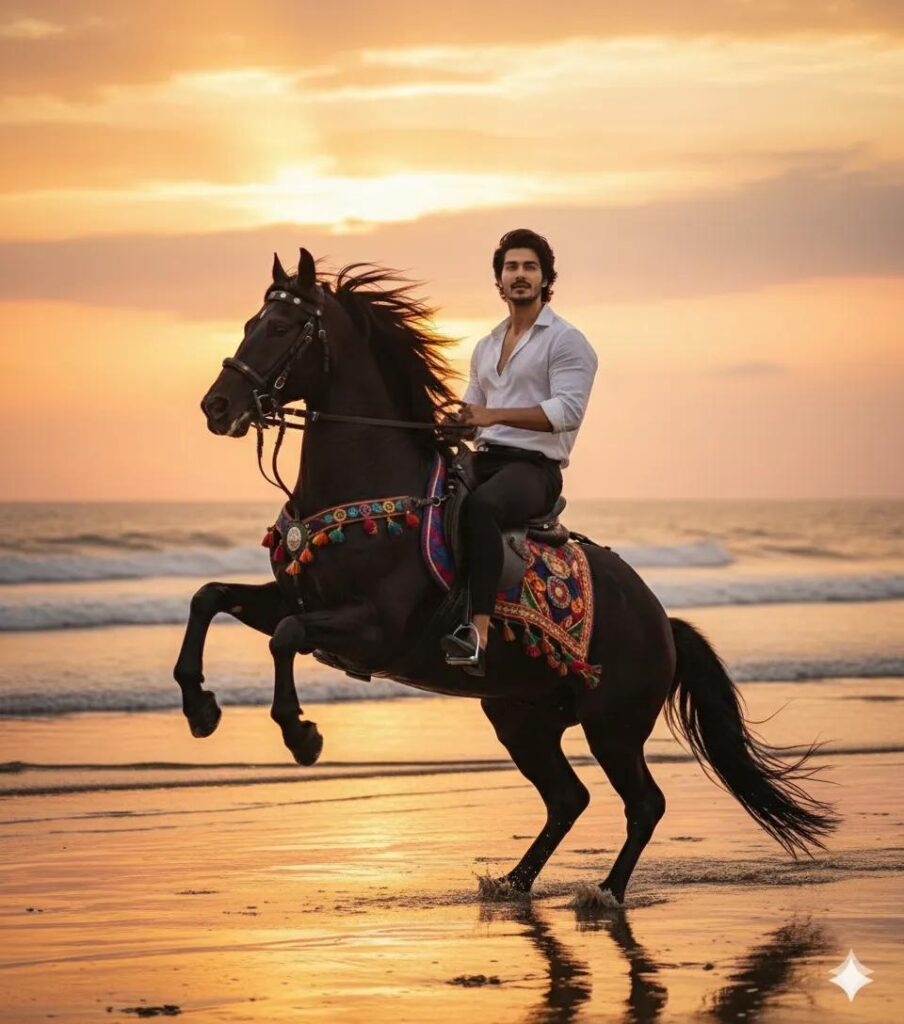 A young man riding a majestic black horse on a sea beach during sunset. The horse is rearing up on its hind legs, decorated with traditional colorful saddle and ornaments. The man wears a crisp white open-collar shirt and fitted black pants, holding the reins confidently with a calm expression. Behind him, the golden sunset glows over the ocean waves, casting warm orange and pink light across the sky and reflecting on the water. The atmosphere is cinematic, realistic, and filled with dramatic