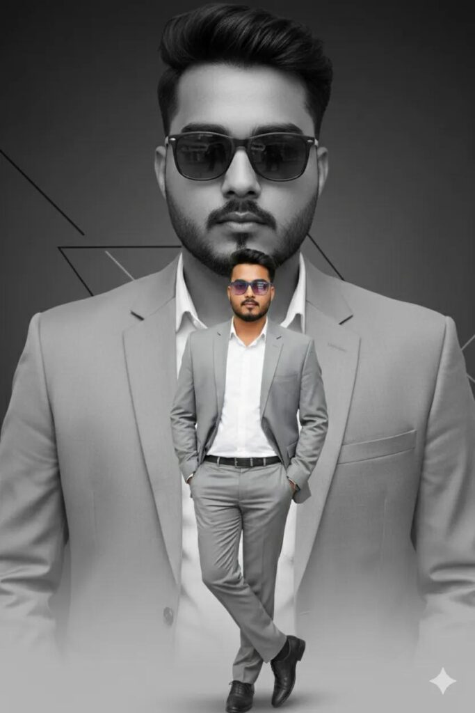 Modern style poster design featuring a stylish man (as per image) with neat messy coma hair with a split personality concept. On the front, a full-color version is shown: the man is wearing a modern light gray suit, standing casually with one leg crossed in front, hands in pockets, a confident and charismatic face. In the background, a black-and-white version of him is seen wearing sunglasses, staring intently ahead with a mysterious expression